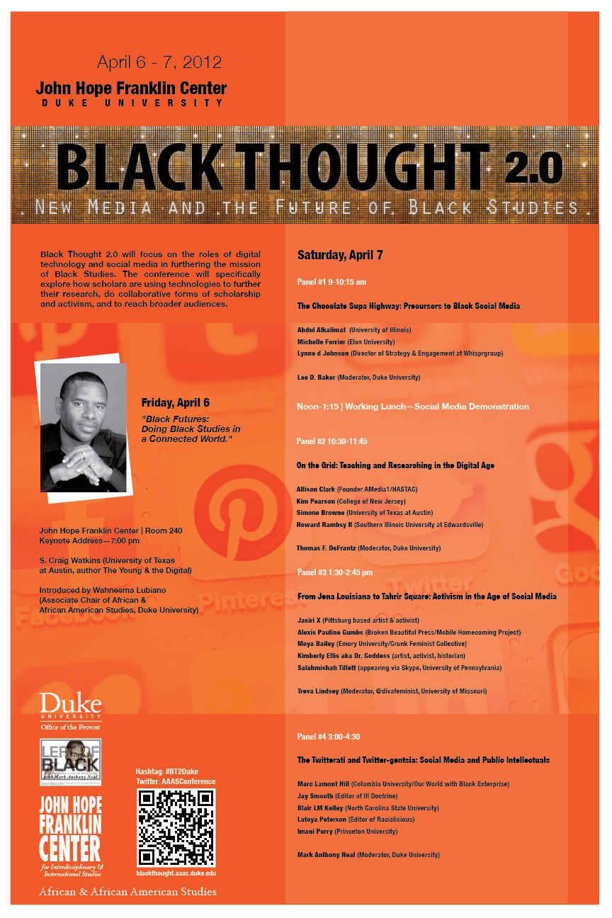 “In many ways Black Thought 2.0 is an attempt to encourage black scholars and academics to catch up to our audience,” said conference organizer Mark Anthony Neal, a professor of black popular culture at Duke. “Given our rich tradition of public intellectuals, dating back to figures like Fredrick Douglass and Sojourner Truth, it just seems as though new media represents another way for black intellectuals to be in the world. Imagine what W.E.B. Dubois might have done with a Twitter feed?”