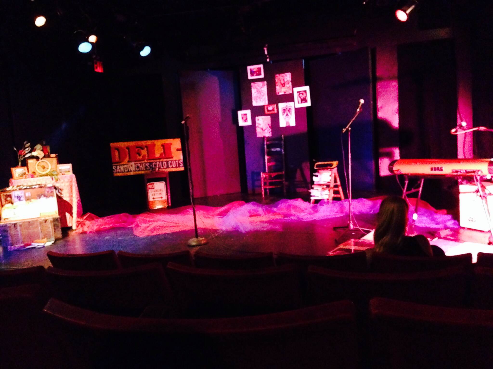 Monet’s stage set up for the intimate atmosphere — a room of her own filled with her belongings — a chest box filled with family pictures, albums and other items, behind it a table alter of sorts, old street signs (a deli and no standing anytime), wall posters and photographs of James Baldwin and Zora Neal Hurston along with an African-styled mask drawing, on the floor various album covers and posters, a step ladder filled with books and a typewriter on top and an old wooden chair. With this and the jazz soundtrack, the audience situated into Monet’s innerverse.